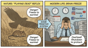 野生動物の世界では、天敵(例えば、鷹)に狙われた小動物が、とっさに「死んだふり(仮死状態)」をして身を守るのをご存知でしょうか? 実は今、「何もしたくない」「動けない」と感じているあなたの脳内で、それと同じことが起きています。
