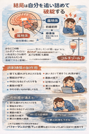 結局、脳の機能が低下し、記憶力も低下し、意欲が出なくなり、喜びの感覚がなくなり、人と関わるのが苦痛になってしまうのです。これでは能力が発揮できなくなり仕事の効率も下がってしまうのです。その状態がさらに進むと燃え尽き症候群やうつ病に至る場合もあるのです。