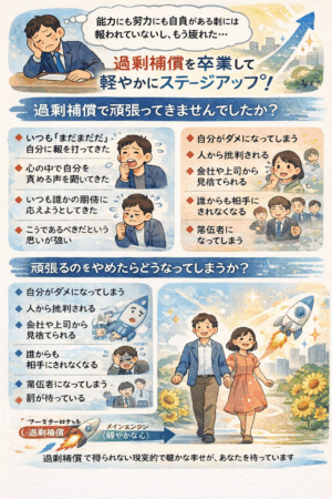 その苦しい頑張り方のことを心理学用語で「過剰補償」と言います。言うなれば「心のブースターロケット」です。あなたはそろそろ、このブースターロケットを手放して、メインエンジンに点火する時が来ているのかもしれません。