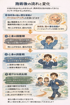 書き換えの後は、コルチゾールのレベルが急激に下がることで一時的にぐったり感が出て、睡眠時間が増えると思いますが、それは脳の中でニューロンネットワークの組み替え作業が行われるからです。
