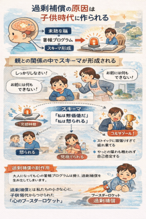 そのため、「私は無価値だ」「私は怒られる」というスキーマが作られました。それで萎縮しやすく、いじけやすいという傾向を持ちました。やがて、大人になる過程で、「自分の価値を高めて褒められる人間になりたい」という意識が強く働くようになりました。「無価値」「怒られる」の逆方向です。このような心の働きが「過剰補償」です。