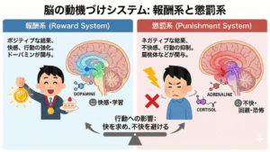 人間を動機づけるシステムには、罰を逃れようとして働く懲罰系と喜びを得ようとして働く報酬系の2種類があります。前者はストレス状態を作り短期間にエネルギーを出すことができますが、使い続けると消耗し疲弊します。後者は、ワクワク状態を作り、持続可能です。