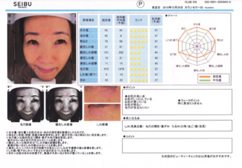 データのウィークポイントは見当たりません。という大変良好なデータ結果となったわけですが、驚いたことに、毛穴の数は半分以下、キメは同年齢平均の2倍となり、毛穴が少なく、キメが細かく潤いのあるお肌と鑑定されました。