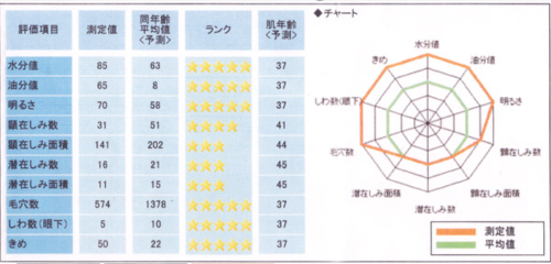 その結果、私の肌は通常スッピンで、下記のデータの通り、肌解析の肌年齢は37歳という年齢よりも15歳若い数値がたくさん出る結果となったのです。