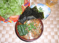 人参と大根、ごぼうを千切りにして、だし汁に入れて数分間茹でた後、茹で上がった半人前の蕎麦を入れて出来上がり。海苔、あさつき、ほうれん草などを添える。